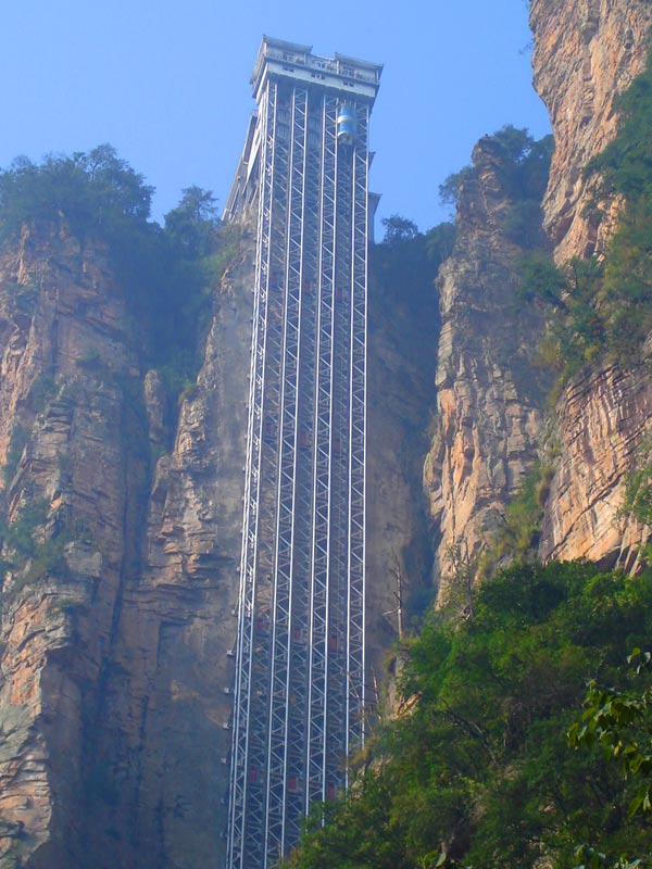 百龍?zhí)焯?BR>    百龍?zhí)焯荩怪备卟?35米,運(yùn)行高度326米,由154米山體內(nèi)堅(jiān)井和172米貼山鋼結(jié)構(gòu)井架等組成,采用三臺(tái)雙層全暴露觀光電梯并列分體運(yùn)行,每臺(tái)次載客50人次,運(yùn)行速度3米/秒,三臺(tái)同時(shí)運(yùn)行每小時(shí)往返量達(dá)4000人次。百龍?zhí)焯莸男藿▽?shí)現(xiàn)“山上游,山下住”的目標(biāo),提供了交通保障,將袁家界天下第一橋、迷魂臺(tái)、天懸白練以及烏龍寨、楊家界等絕世美景從幕后推向了前臺(tái),并將天子山、袁家界、金鞭溪等精品旅游線路連為一體,解決了多年困擾景區(qū)的交通瓶頸問題。