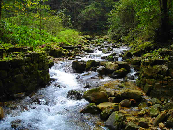 在黃石寨與袁家界之間有一道長(zhǎng)長(zhǎng)的峽谷將兩山隔開,峽谷中有一條小溪水,溪水從“天下第一橋”下面淙淙流過,這便是有名的“沙刀溝”。