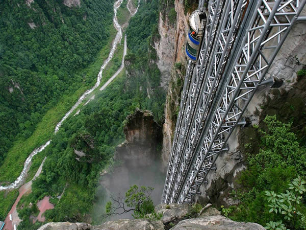 百龍電梯位于世界自然遺產(chǎn)張家界武陵源風(fēng)景區(qū)。工程分布在4.5公里,垂直高差385米的核心景區(qū)。電梯運(yùn)行高度326米,主體由154米山體豎井和172米貼山鋼結(jié)構(gòu)井架等組成,采用三臺(tái)雙層全暴露觀光電梯并列分體運(yùn)行。是連通森林公園、金鞭溪、水繞四門(mén)到袁家界、烏龍寨、天子山的重要觀光交通設(shè)施。百龍?zhí)焯莨こ毯陚、工藝?fù)雜,施工驚險(xiǎn),堪稱(chēng)“世界工程奇觀”。它的建成創(chuàng)造了三項(xiàng)基尼斯世界紀(jì)錄。