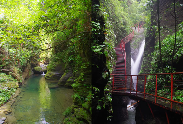 十八潭總名。稍作休憩,我們開(kāi)始奔赴東線的景點(diǎn)。東線主要是以十八潭為主,下游有4潭:合潭、梳妝潭、魚(yú)潭、黑潭;中游有9潭:換衣潭、美人潭、石蛙潭、姊妹潭(3個(gè))、情侶潭(2個(gè))、二龍搶珠,上游有5潭:鬼谷神功(2個(gè))、幽潭、落銀潭(彩虹潭)、路邊潭。十八個(gè)潭深淺不一,淺則1米以上,深則4米左右,形狀各異,有的月牙形,有的豬腰狀,形狀不規(guī)則,石壁上水沖成潭,真是鬼谷神功,此處水質(zhì)細(xì)膩,加之綠林映襯,水色碧綠見(jiàn)底,猶如十八顆翡翠石鑲嵌在山林之間,涓涓溪流晶瑩剔透,飛流直下的瀑布,氣勢(shì)磅礴,蔚為壯觀, 下游的4潭,合潭、梳妝潭、魚(yú)潭、黑潭。合潭是仙女峽谷與十八潭的交匯處;梳妝潭的水清如明鏡,又因?yàn)樘秲蓚?cè)石頭的封閉,使這面鏡子靜止不動(dòng),很方便梳妝,照鏡子。在梳妝潭周?chē),有一種植物屬于紅豆杉系列,它的形狀好似梳子,可以用來(lái)梳頭。魚(yú)潭可不能望文生義。魚(yú)潭,是在冬天的時(shí)候,所有的魚(yú)都聚集在這里過(guò)冬,除此之外,這個(gè)潭水淺見(jiàn)底,冬天魚(yú)苗聚集,是捕魚(yú)的好季節(jié)。黑潭,水深不見(jiàn)底,所以叫黑潭,F(xiàn)在已經(jīng)看不見(jiàn)梳妝潭、魚(yú)潭、黑潭了,你猜為什么?建水庫(kù),建水上樂(lè)園,淹沒(méi)了。 斷魂石的傳說(shuō)。三國(guó)時(shí)期,高氏和蕭氏一對(duì)夫妻春節(jié)忙活,遇上了天門(mén)垮眼,受余震襲擊,打死了丈夫蕭氏。高氏思念丈夫,淚哭不斷,結(jié)果摔死潭中。人們經(jīng)常還能聽(tīng)到哭聲傳來(lái),不敢單獨(dú)行走,需成群結(jié)隊(duì)。后人為了鎮(zhèn)邪,雕刻一條蜈蚣驅(qū)趕哭魂,多年后,蜈蚣成精,天上打雷,巖石發(fā)光,遭雷所劈,成了斷魂石。 和尚姥,也就是丹灶峰,天門(mén)十六峰之一。相傳此峰為仙人化身,赤松子曾在此煉丹,許多詩(shī)人在此留下了美妙的詩(shī)篇,明代葉守禮《丹灶峰》: 懸崖峭壁隔塵寰,上有仙人學(xué)煉丹。 煉得丹成鶴已去,獨(dú)留丹灶在峰巒。 意思是說(shuō),在這險(xiǎn)峻秀麗的山峰上,赤松子潛心煉丹,不受塵世干擾,身心沉醉于秀美的山間,沉溺于丹藥的煉制之中。作者很是羨慕那種與世隔絕的超脫,那種執(zhí)著于自我理想的瀟灑,你羨慕不羨慕? 竹林叢生。我們要學(xué)習(xí)竹子的精神,中空、謙卑;我們要學(xué)習(xí)竹子的精神,抱團(tuán)生長(zhǎng);我們要學(xué)習(xí)竹子的精神,破土而出,節(jié)節(jié)高。 向家塔。打造農(nóng)耕養(yǎng)生游的地方。種田、種菜、種花,農(nóng)家餐館。 爛泥巴根。爛泥巴根和馬桑樹(shù)是同科,是這里獨(dú)特的一種樹(shù)。馬桑樹(shù)亦稱“千年紅”、“馬鞍子”,屬落葉灌木,馬桑樹(shù)多枝叢生,一簇一簇的,枝葉像傘蓋,因此“馬桑樹(shù)兒搭燈臺(tái)”。春風(fēng)一吹,滿山的馬桑樹(shù)、爛泥巴根就吐翠滴綠,顯示出強(qiáng)勁的生命力。打油詩(shī)一首: 青青枝條四方走, 肥肥大葉落上頭, 身在路邊無(wú)人問(wèn), 冬去春來(lái)樂(lè)悠悠。 秋天死亡,春天長(zhǎng)勢(shì)更加茂盛,它的新生是通過(guò)死亡實(shí)現(xiàn)的。山川如此,植物也是如此,這里的一草一木無(wú)不透露著道家那種齊生死、等貴賤的精神。 這叫“常道”亭,“道可道,非常道”,據(jù)說(shuō)是白狐與劉海相遇的地方。吊橋。 十八潭各具特色。 中游有9潭。第五潭叫換衣潭。巖石聳立,霧氣氤氳,巖壁上布滿水汽,猶如雨下。又因過(guò)道狹窄,行人需彎腰通過(guò),未免雨水打濕衣裳,在此就要脫下身上衣物,通過(guò)后在第六潭再穿上。因此第六潭又叫美人潭,很幽深神秘的。第七潭叫石蛙潭,水淺,又比較平穩(wěn)、安全,春天產(chǎn)籽。余音回響,猶如蛙鳴,給人“聽(tīng)取蛙聲一片”的錯(cuò)覺(jué)。 對(duì)面巖壁叫“臘肉鋪”,那條自上而下的溪流叫“酒長(zhǎng)流”,客人來(lái)了,咱土家人熱情,臘肉下炕,苞谷燒,喝兩口! 第八潭第九潭叫情侶潭,比較隱蔽,他倆靜悄悄地談著情話,我們快走,不要打攪他們。 第十潭、十一潭、十二潭叫姊妹潭。下面那個(gè),水淺淺的,溫溫的,是幺妹潭,中間那個(gè)是二哥潭,上面那個(gè)是大哥潭。 潭的旁邊有珍稀植物馬蘭花,馬蘭花又名蝴蝶花、蝴蝶蘭,為多年生宿根草本花卉,根莖短粗,肥壯;ù笮缕妫ㄉk麗,鮮艷奪目;ㄓ兴{(lán)、白、黃、雪青等色;ㄆ5-6個(gè)月,每次花可開(kāi)花7-10天,頗耐觀賞。馬蘭花在我國(guó)栽培已有2000多年的歷史,目前歐、亞、非3洲均有分布,品種極多,難以計(jì)數(shù)。此花按植株高度不同可分3種類(lèi)型:矮株型僅18-25厘米,中株型高25-70厘米,高株型可高達(dá)120厘米。馬蘭花喜陽(yáng)光,適栽于背風(fēng)向砂質(zhì)土壤中。 馬蘭開(kāi)花的童謠。他們?nèi)⒚眯r(shí)候情感深厚,常常一起跳皮筋。大家會(huì)跳嗎?會(huì)唱嗎? 小汽車(chē),滴滴滴,馬蘭開(kāi)花二十一, 二五六二五七,二八二九三十一, 三五六三五七,三八三九四十一, 四五六四五七,四八四九五十一, 五五六五五七,五八五九六十一 ! 還有紅豆杉,像梳頭的篦子,叫“篦子三尖杉”。還有蘭心草,中草藥,空中飄來(lái)蘭花的香氣,山谷中峭壁的蘭花,如芳芳人品善良高雅。蘭花如人品有宜人的香氣,蘭花有撩人的幽香,任何花卉的香氣都不能與蘭花比。這幽香時(shí)隱時(shí)現(xiàn),時(shí