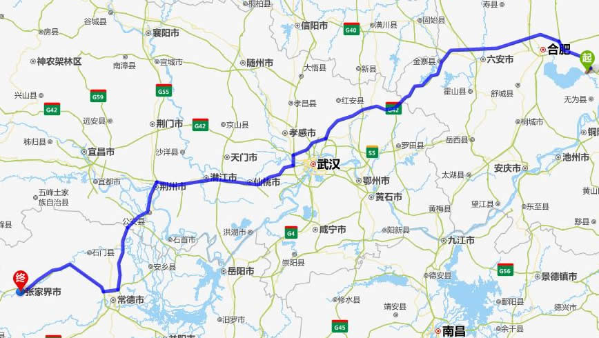 左右,沿途經過巢湖——合肥——六安——金寨縣——麻城市——漢川市——仙桃市——潛江市——荊州市——公安縣——澧縣——常德(也可以走國道經澧縣、石門縣)——慈利——張家界。